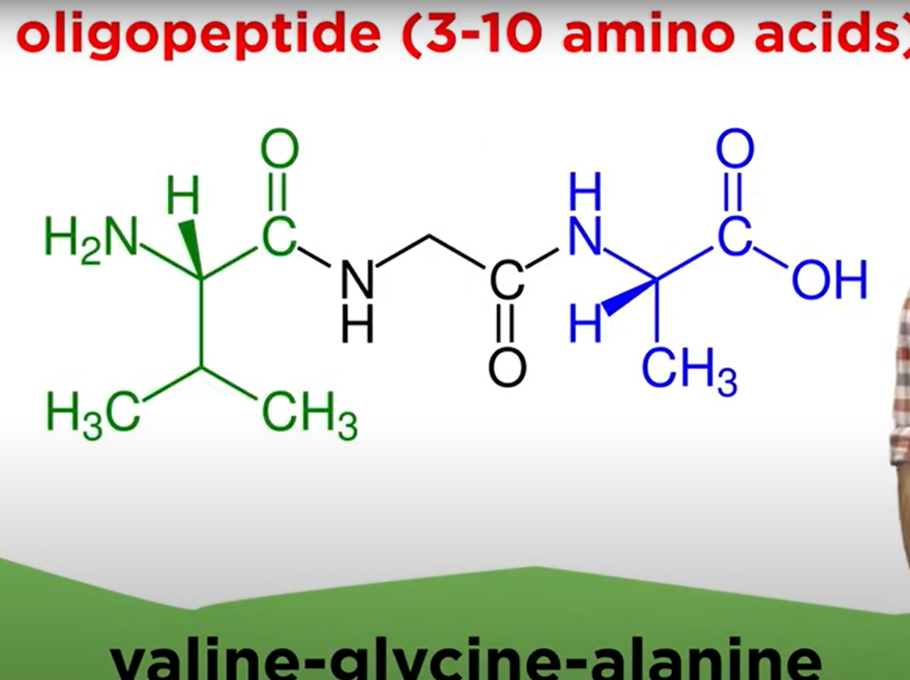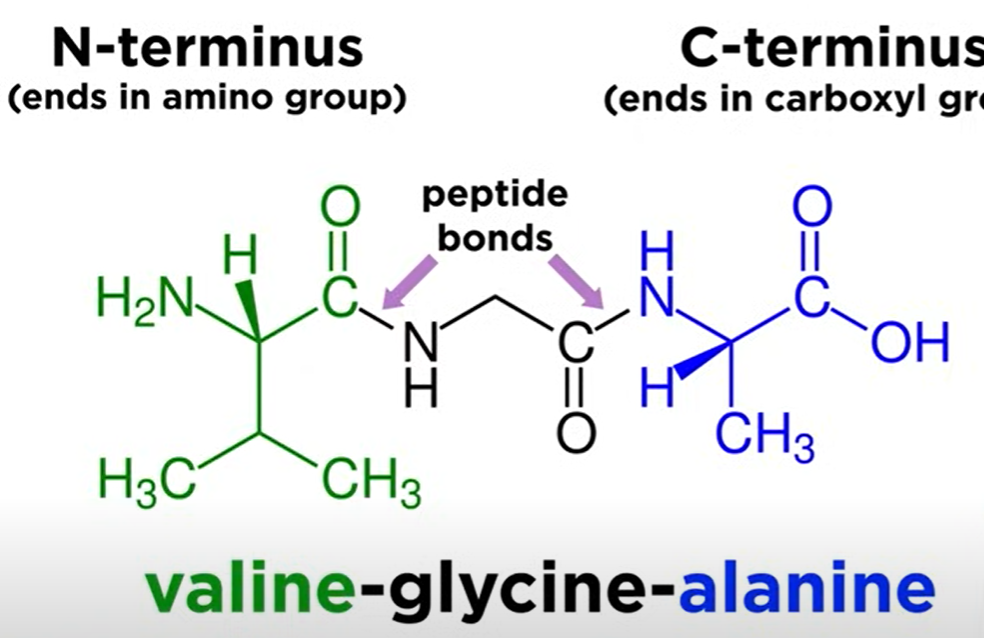 Each monomeric unit in the polypeptide is called residue, which can be differentiated by polypeptide bonds. In the example above there are three residues: valine, glycine and alanine.