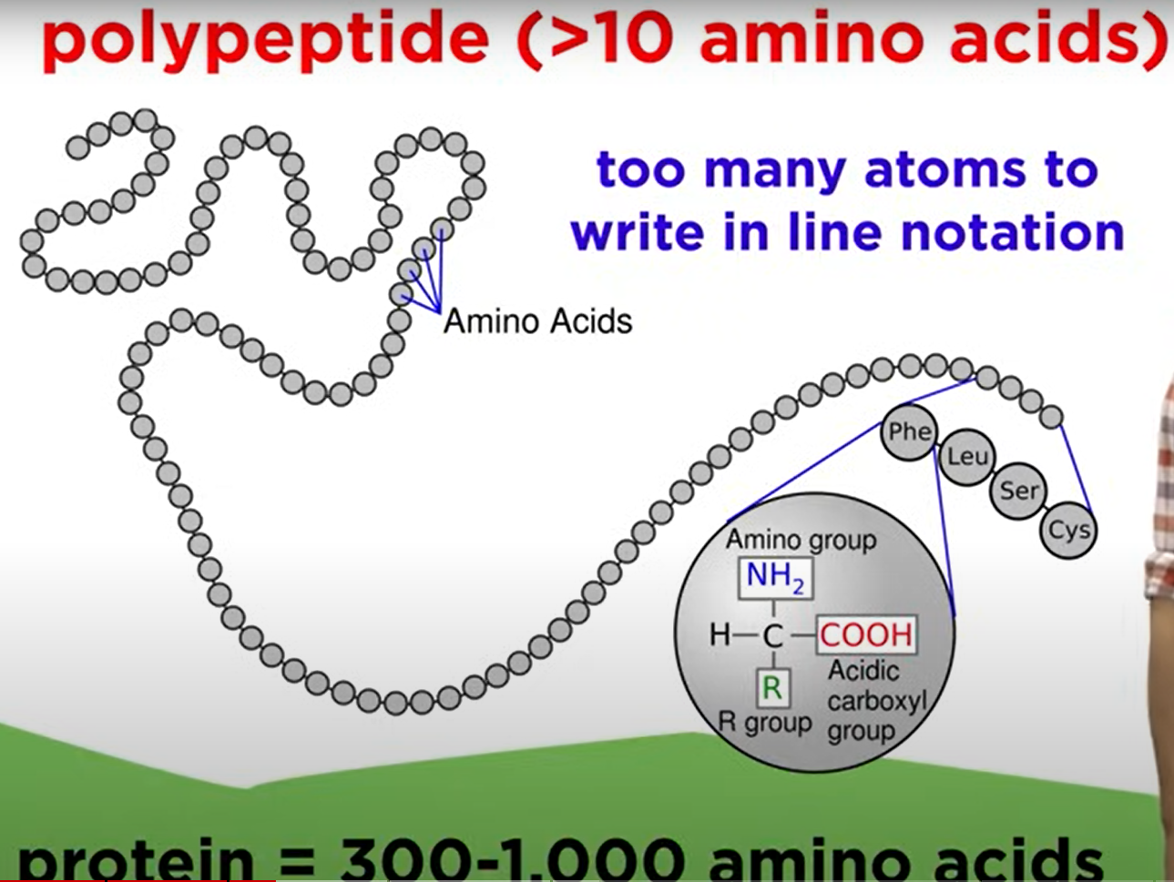 - Polypeptide: More than 10 amino acids, often around 300-1000 amino acids in functional proteins.
