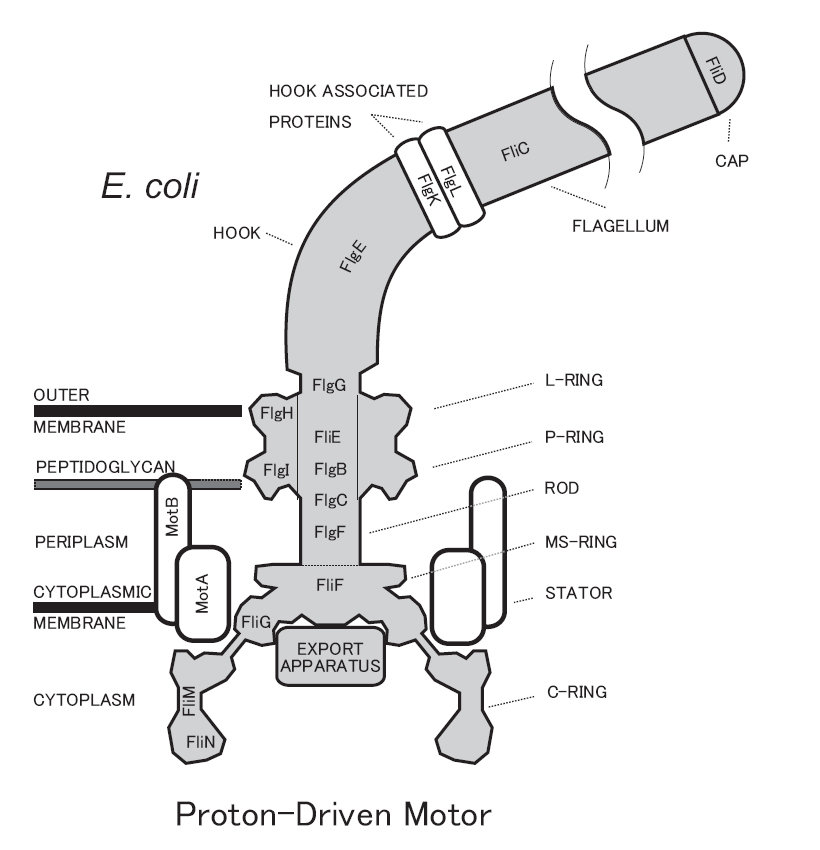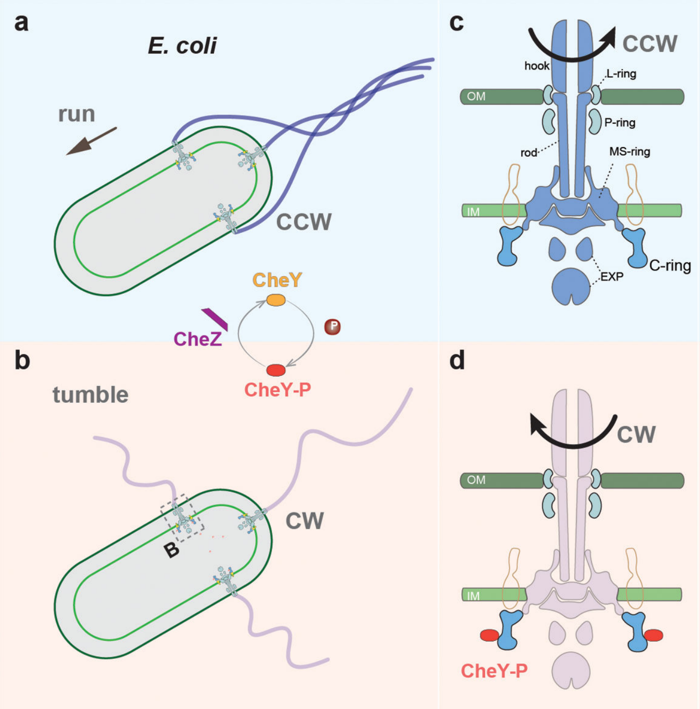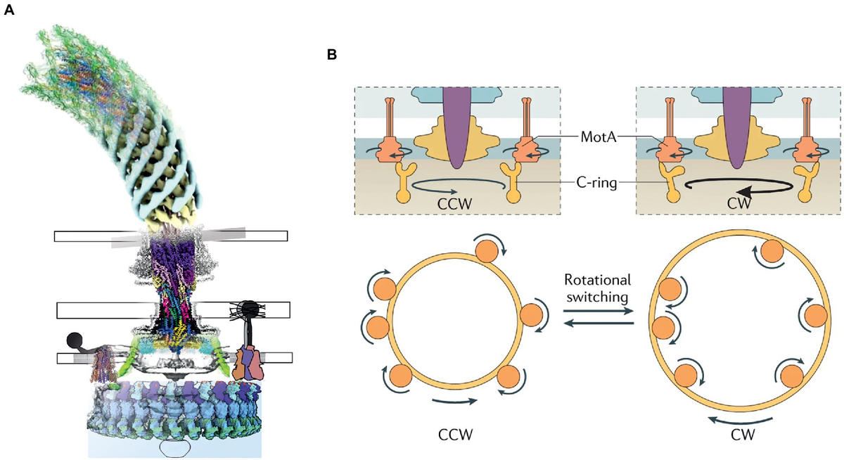 So the CCW and CW rotations would not be able to produces run and tumble (respectively) if there was only one flagellum on a bacteria. But a bacteria has multiple flagella (at least E. Coli does, that’s the only one I know so far). This diagram from @changMolecularMechanismRotational2020 paints a clearer picture: